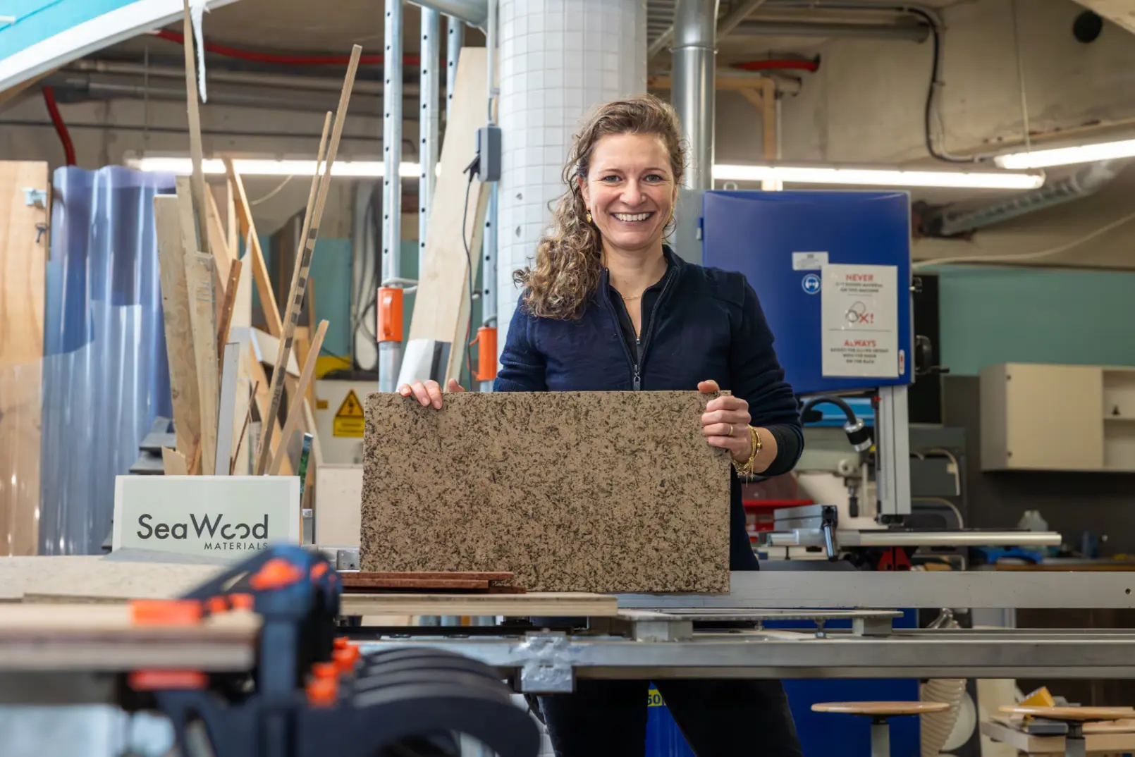 Ligt de toekomst van duurzaam bouwen in zee? Volgens de ontwerper deels wel. Met haar bedrijf BlueBlocks Concepts maakt ze plaatmateriaal van zeewier. Op basis van de test bij The Green Village is deze wand van zeewier verbeterd. Dat product is nu opgeschaald bij de Alliantie. "De Alliantie ziet veel kansen voor SeaWood als product. Omdat er zeewier wordt gebruikt in plaats van een landbouwgewas. Hiervoor is dus geen grond nodig.”