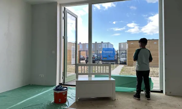 De Kreekvelden in Oosterwold is het groenste project van de Alliantie tot nu toe. De bewoners van deze bijzondere houtenwoningen kregen vorige week de sleutel van hun nieuwe thuis. De 8-jarige Moes gaat hier samen met zijn ouders en 2 zusjes wonen.