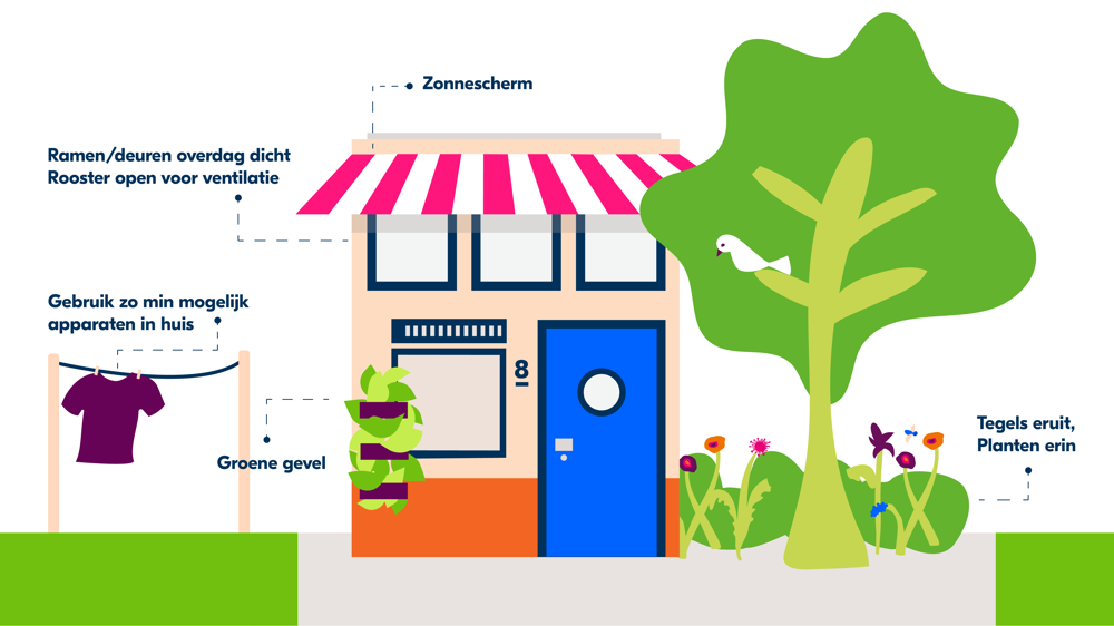 Wist je dat een tuin met tegels tot wel 7 graden warmer wordt dan een tuin met beplanting? Tegels eruit en groen erin. Want een groene tuin geeft verkoeling. En bij hoosbuien kan het water makkelijker weg. Dus minder wateroverlast.