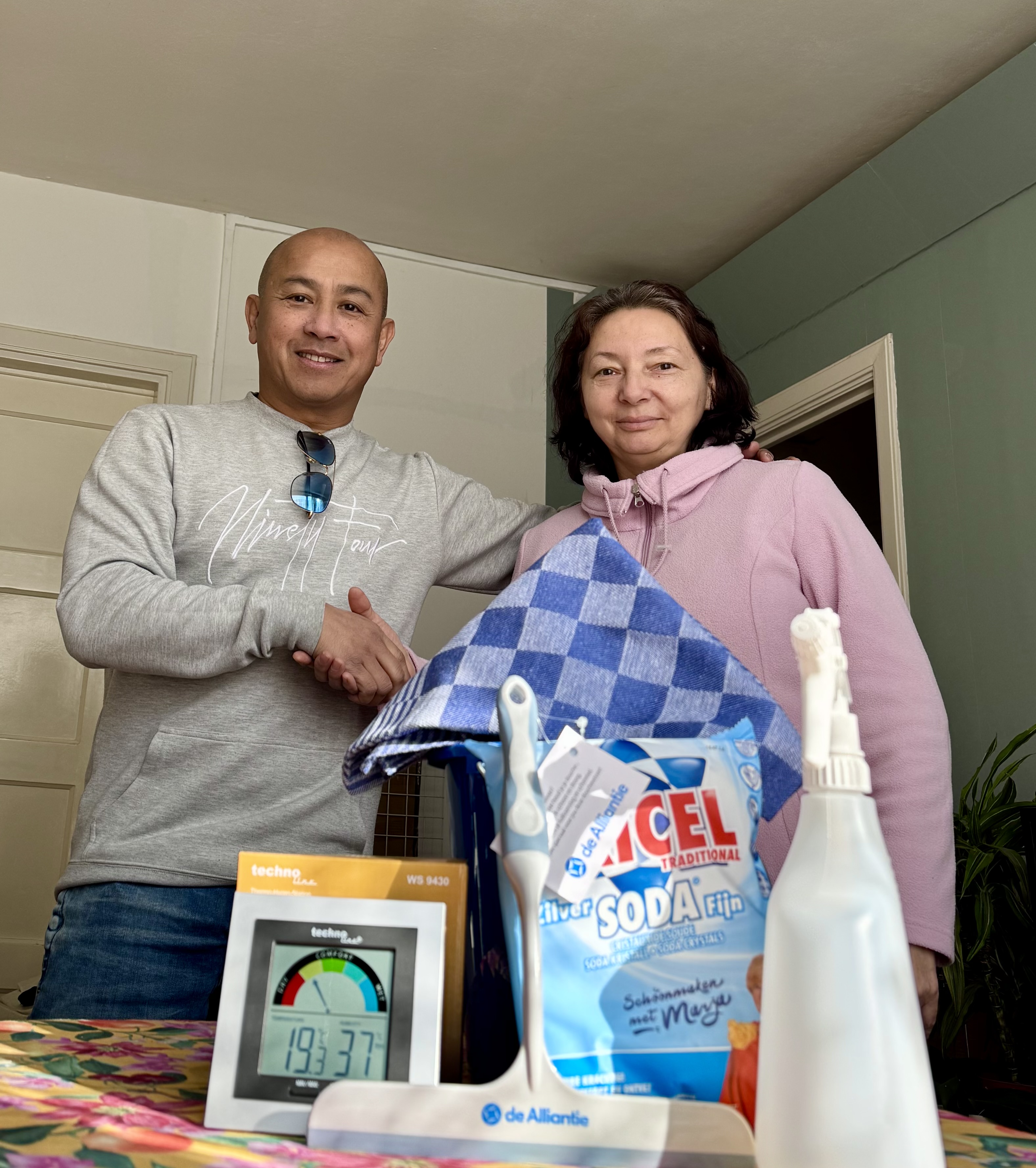 “Dave vertelde ook dat je schimmelplekjes meteen weg moet halen met soda en warm water. Ik kreeg een pakketje van hem met een wisser, doek, spray, soda en een vochtmeter. Daarmee kan ik precies zien of er teveel vocht in huis is. En als dat zo is, zet ik de ramen open om lekker te ventileren.”