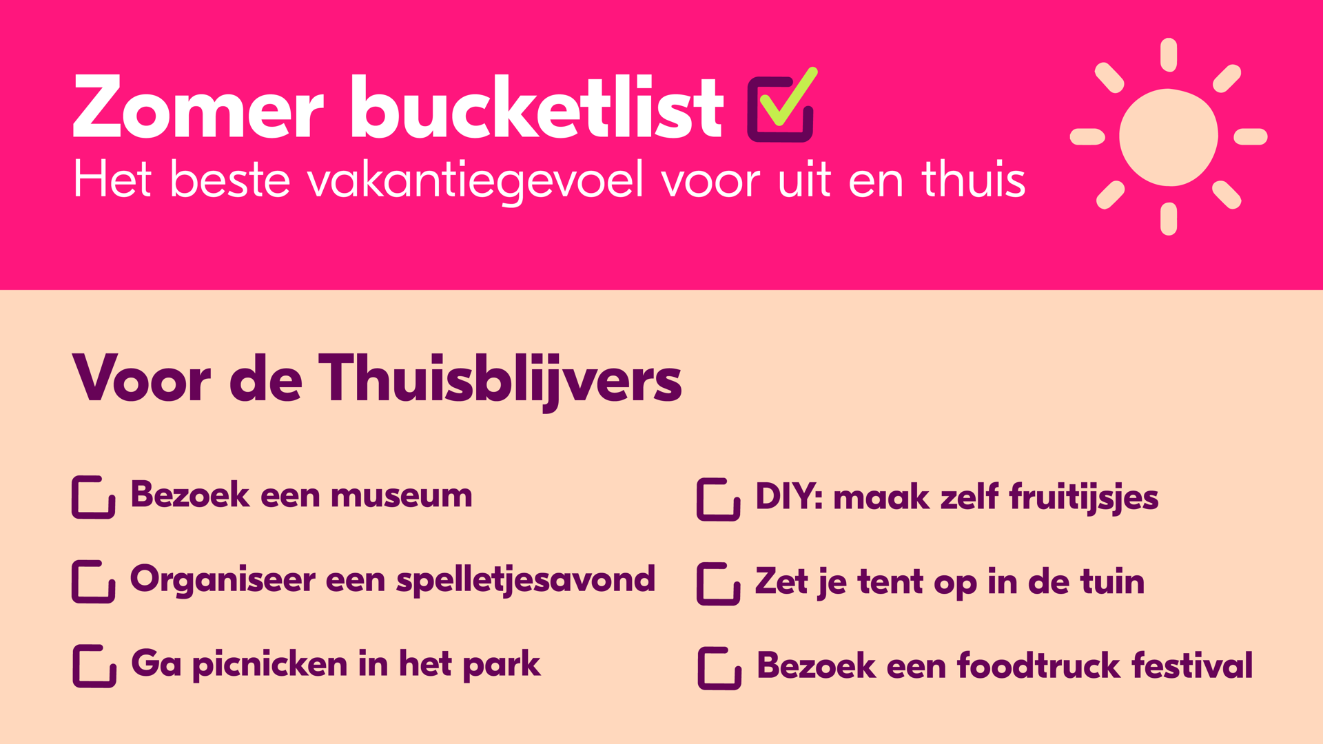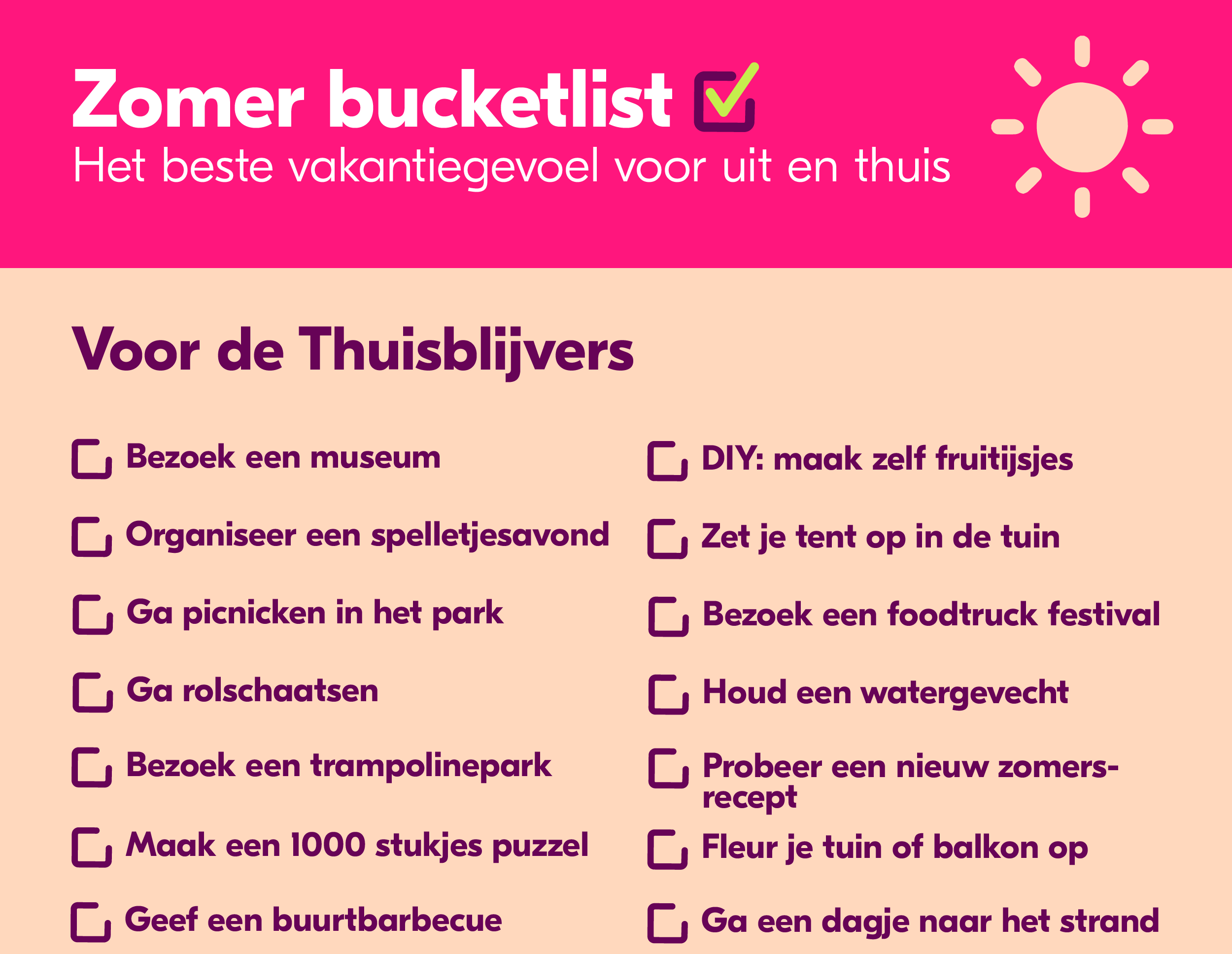 Of je nou op vakantie gaat of lekker thuis blijft? Met deze bucketlist wordt het sowieso een fijne zomer!
