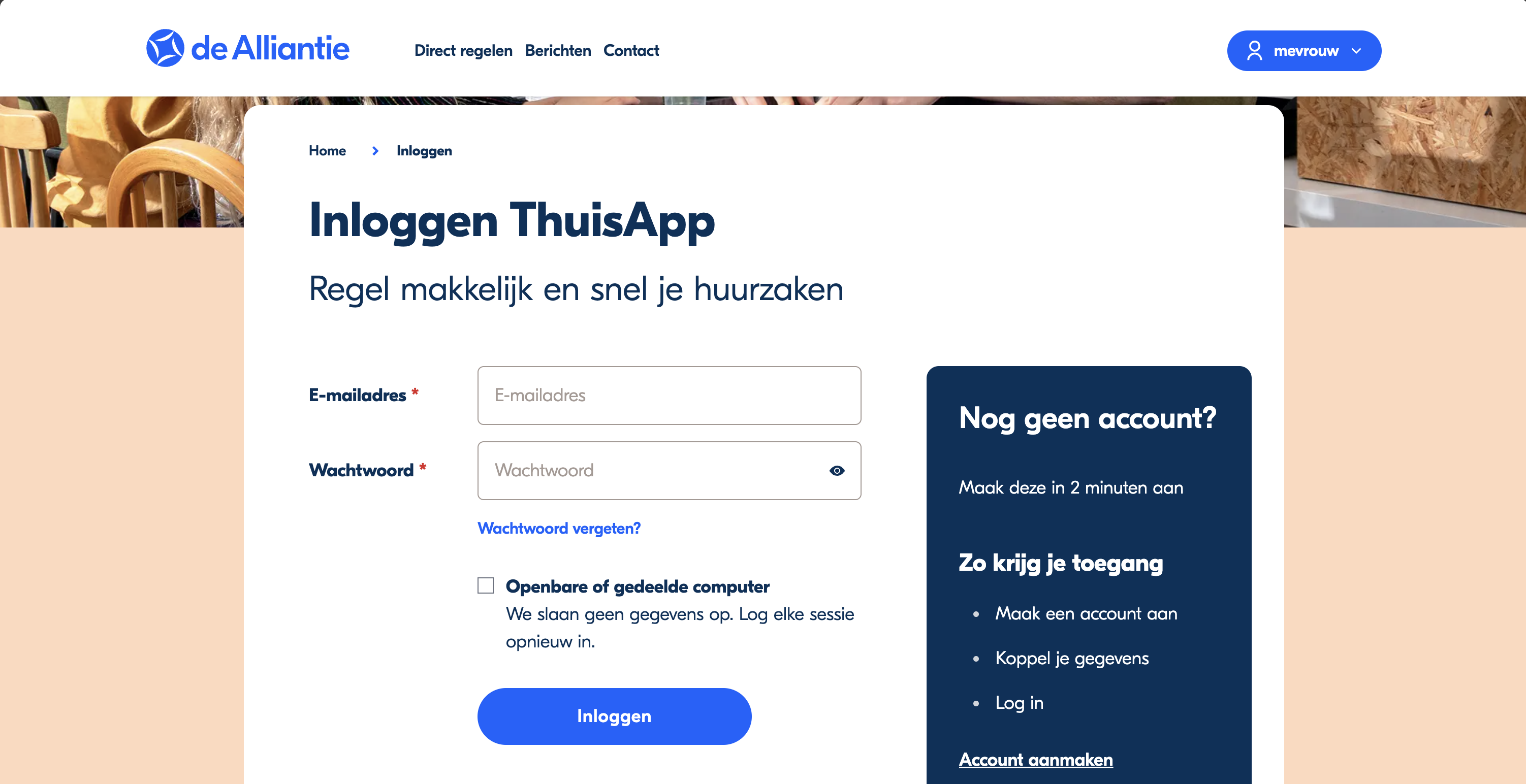 Vanaf 27 november 15.00 uur zijn onze ICT-systemen even uit de lucht. We verhuizen dan Mijn Alliantie - de persoonlijke online omgeving - naar ThuisApp. We begrijpen dat dit vervelend is. Toch is dit nodig om je straks beter én sneller te kunnen helpen.
