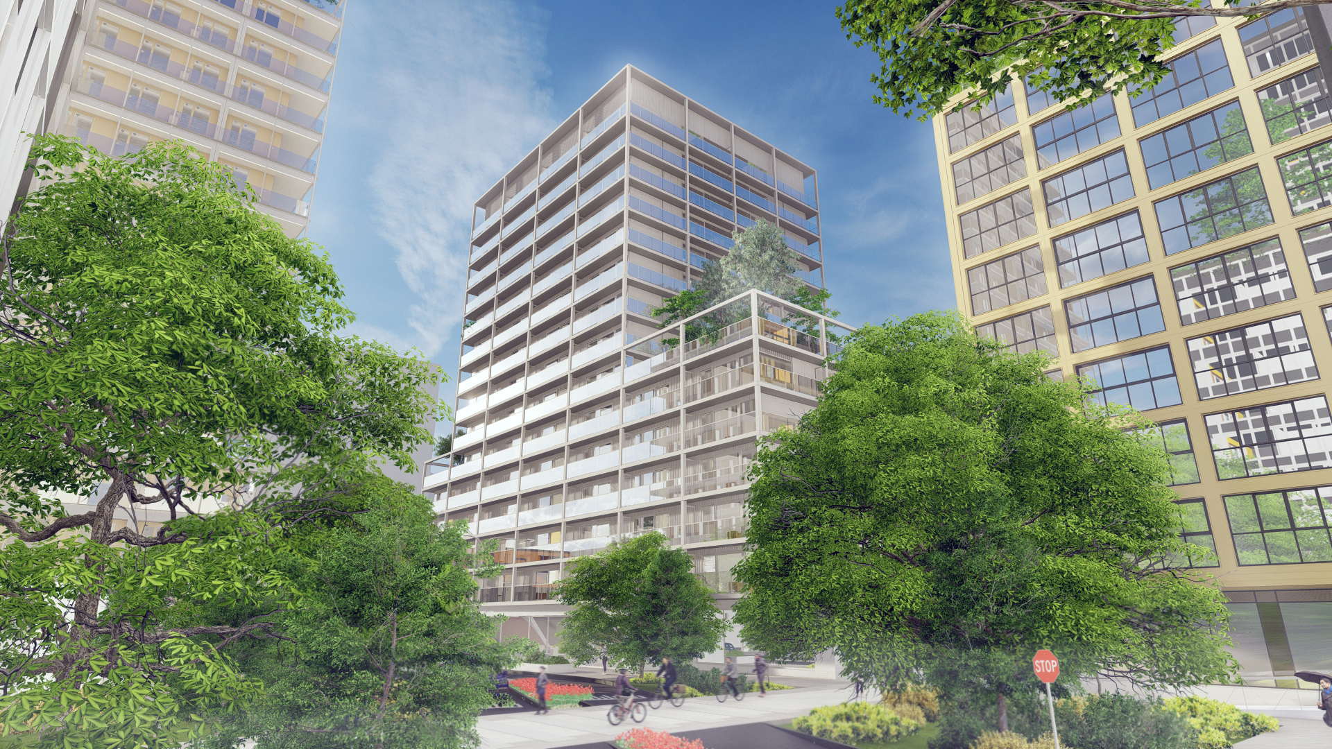 Een impressie van de drie woongebouwen, met eerst de studentenwoningen en daarna de twee blokken met sociale huurwoningen. Je kunt geen rechten aan deze beelden ontlenen.