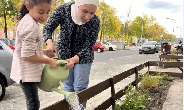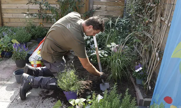 Buurtbewoners zetten samen met wethouder Bart Heller en regiodirecteur Koen Westhoff de schop in de grond in Kerkelanden in Hilversum. Met het symbolisch wippen van tegels en het vergroenen van een tuin ondersteunen zij het bewonersinitiatief ‘Kerkelanden Groent’ – een project dat de wijk groener, gezelliger en meer verbonden maakt.