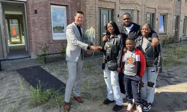 De familie Brammerloo verruilt hun appartement in Amsterdam Zuidoost voor een eengezinswoning met voor- en achtertuin in het Almeerse New Brooklyn. Afgelopen donderdag overhandigde de Alliantie-vastgoedmanager Björn Smits van Beijeren de familie hun sleutels, en een mooie plant voor de nieuwe tuin.