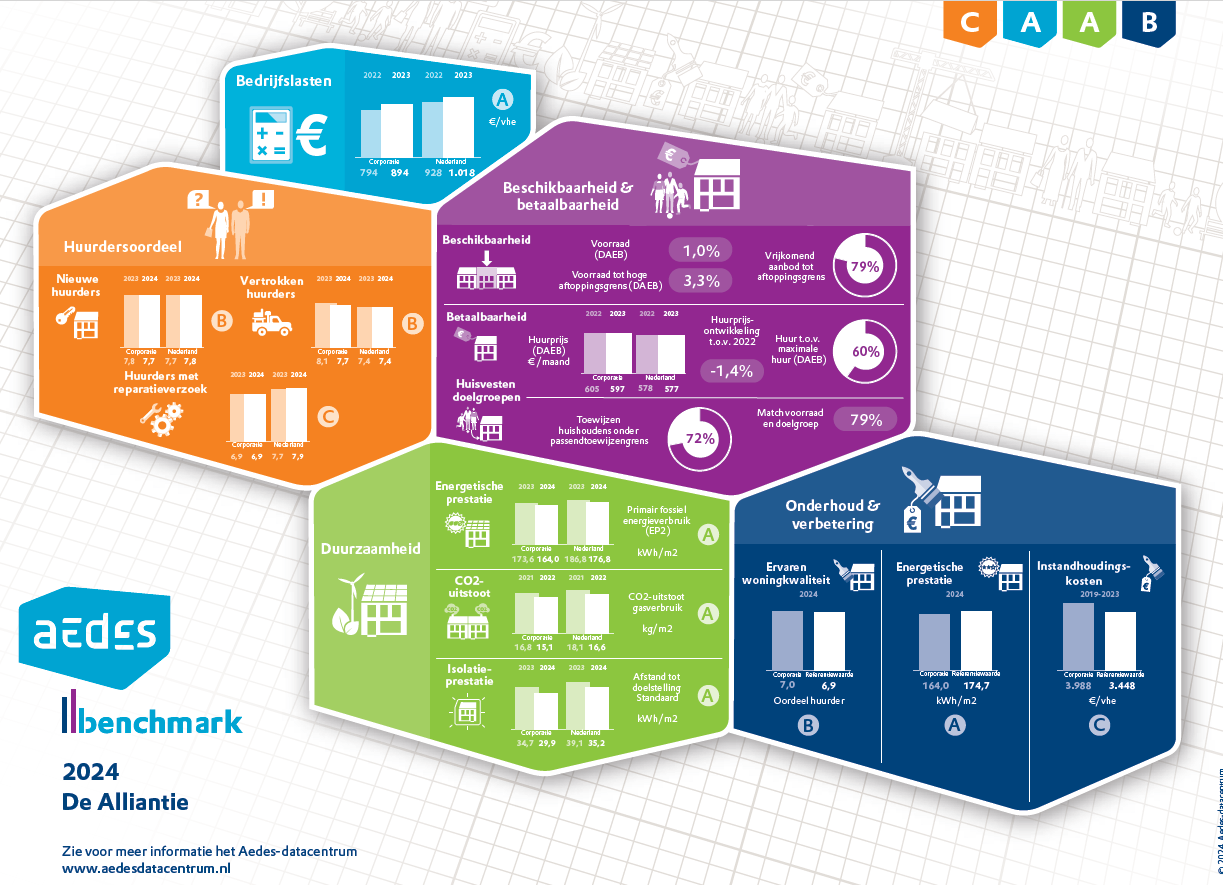 Op donderdag 21 november is de jaarlijkse AEDES benchmark gepubliceerd. In dit onderzoek worden de prestaties van de woningcorporaties onderling vergeleken en beoordeeld met een letter A, B of C, waarbij de A het beste is. Aan de benchmark deden 260 corporaties mee. Zij vertegenwoordigen 98% van het totaal aantal verhuureenheden van woningcorporaties.