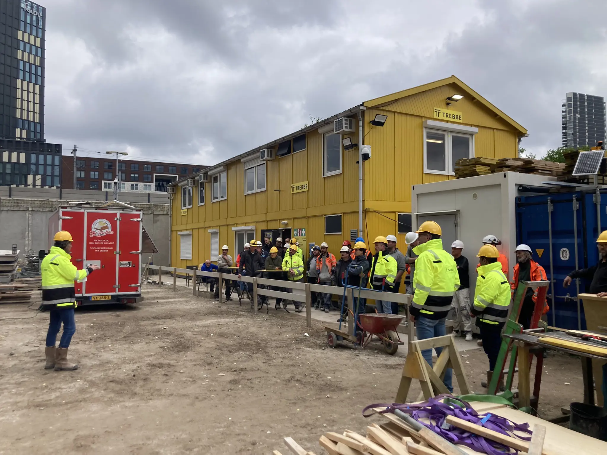 “Het hoogste punt is een belangrijke traditie binnen de bouw”, vertelt Martin Beukeboom, directeur bij Trebbe. “Het hoogste punt, vandaag hier ons hoogtepunt, is het moment dat we onze bouwplaats medewerkers bedanken voor al het werk dat zij al verzet hebben. Want door hun harde werk in weer en wind, kunnen ook hier straks weer 140 huishoudens een duurzaam en betaalbaar thuis betrekken. Ook kijken we samen vooruit naar de volgende mijlpaal; de oplevering.” De liftplaat die het hoogste punt markeert, werd voorzien van een vlag onder toeziend oog van de bouwplaatsmedewerkers geplaatst. Daarna was het, volgens goed gebruik, tijd voor een snack.
