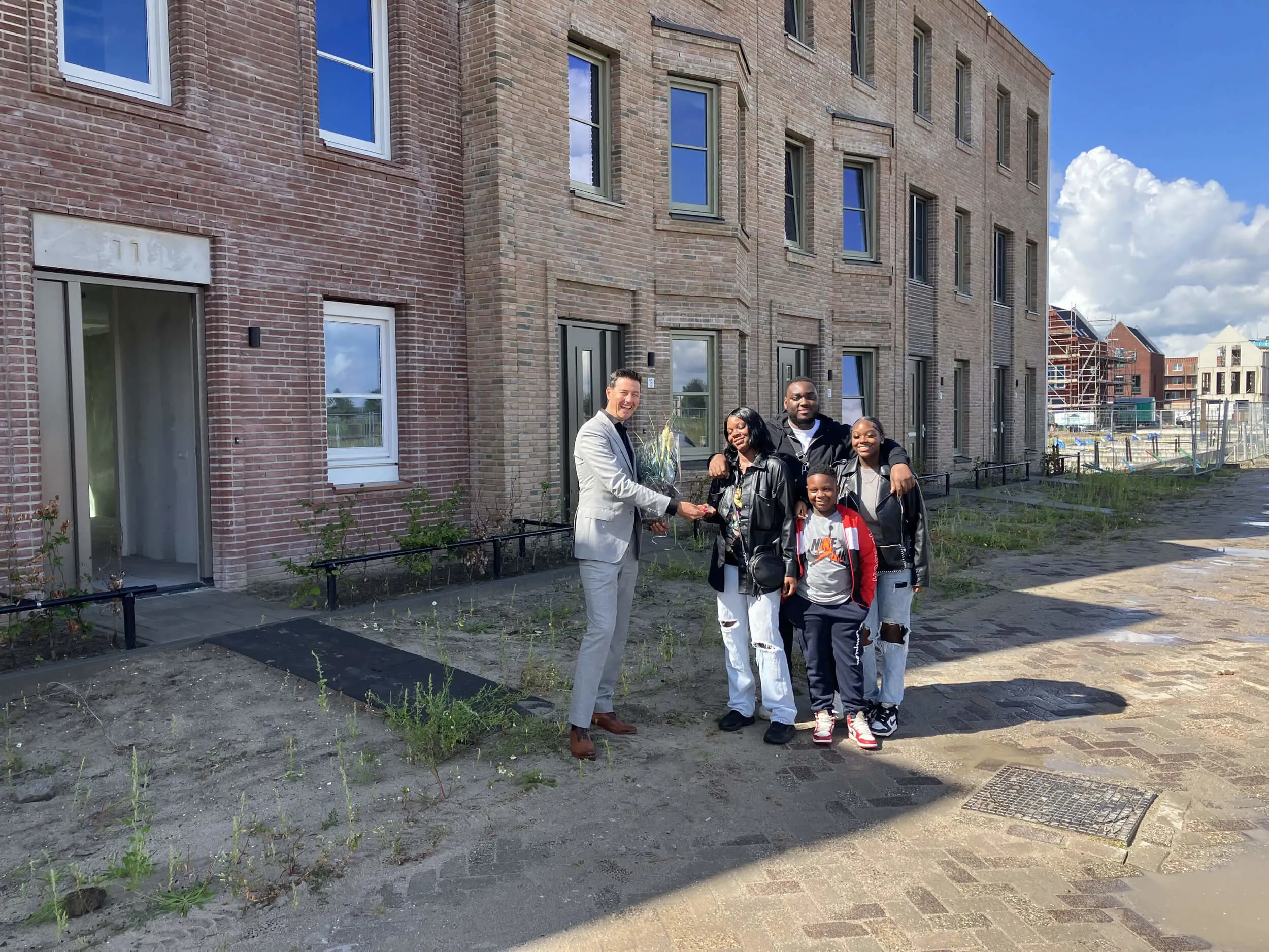De familie Brammerloo verruilt hun appartement in Amsterdam Zuidoost voor een eengezinswoning met voor- en achtertuin in het Almeerse New Brooklyn. Afgelopen donderdag overhandigde Alliantie-vastgoedmanager Björn Smits van Beijeren de familie hun sleutels, en een mooie plant voor de nieuwe tuin.