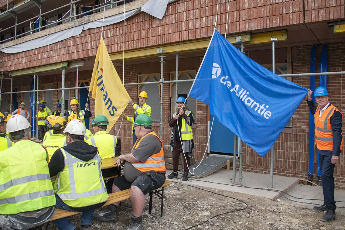 Het hoogste punt is bereikt van project Beverdam in Hoevelaken. Symbolisch werden de vlaggen gehesen door Liesbeth Lossez (manager wonen de Alliantie regio Amersfoort), Jan van Barneveld (directeur de Alliantie Ontwikkeling) en Remco Melgert (directeur Heijmans) samen met wethouder Esther Heutink-Wenderich. Daarna zijn de vaklieden in het zonnetje gezet als blijk van waardering voor hun harde werk.
