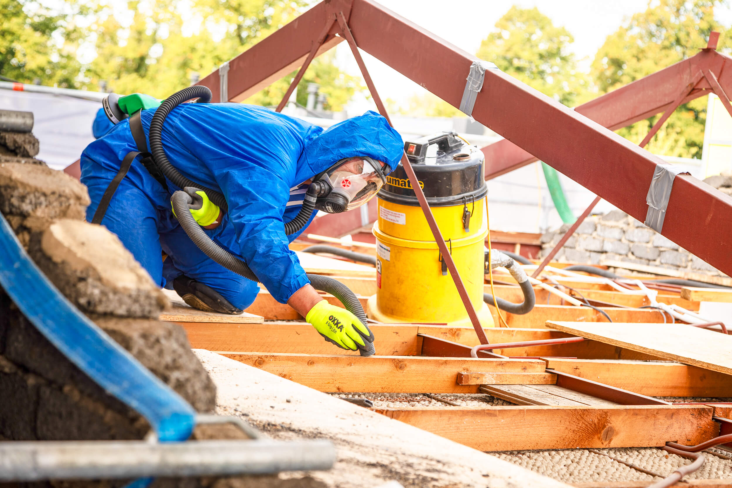 “We wilden de overlast voor bewoners zoveel mogelijk beperken. Bijvoorbeeld door de woning zo min mogelijk te betreden. Daarom bedachten we in samenspraak met de RUD Utrecht een maatwerkplan om het asbest van buitenaf te verwijderen. We maakten een mangat, letterlijk een gat waar een man doorheen past. Zo konden we met een grote stofzuiger eerst de wol wegzuigen om vervolgens het dak in 4 grote delen weg te zagen, waardoor ineens de zolder van de woning aan het daglicht werd blootgesteld.”