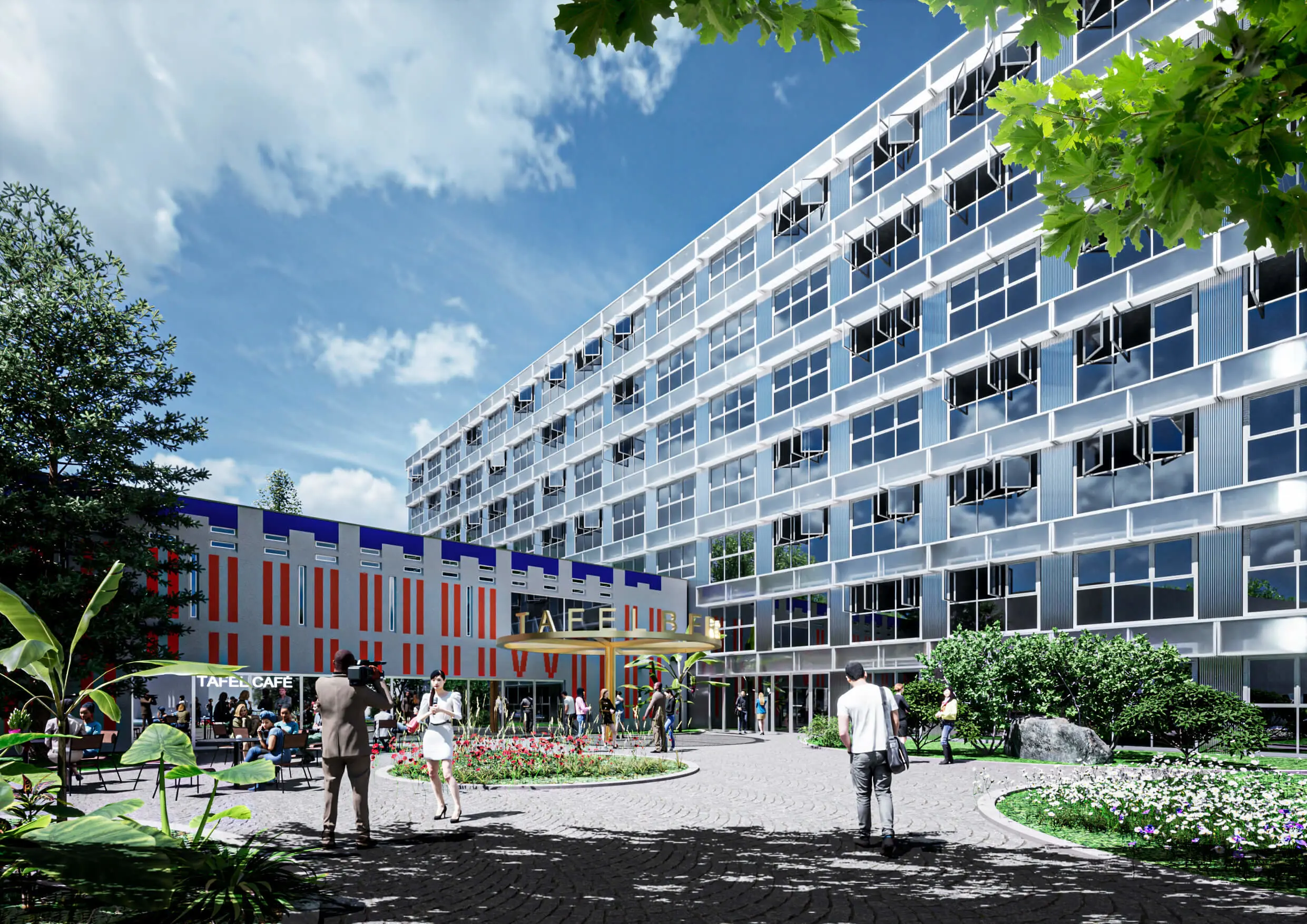 De oude jeugdgevangenis werd razendsnel omgebouwd. De bestaande bouw werd aangepast. Door modulebouw werd in recordtempo een gebouw van 6 etages neergezet, met oog voor voldoende privéruimte en tegelijkertijd faciliteiten voor ontmoeting. De jongeren kunnen zelf kiezen of ze gezelschap willen of de privacy van hun woning opzoeken. Er is een tuin en moestuin. In de lobby zijn er gemeenschappelijke voorzieningen, zoals een wasserette, een brasserie en een huiskamer. En op de begane grond is er ruimte voor maatschappelijke ondernemingen, zoals een café, studio en sportschool.
