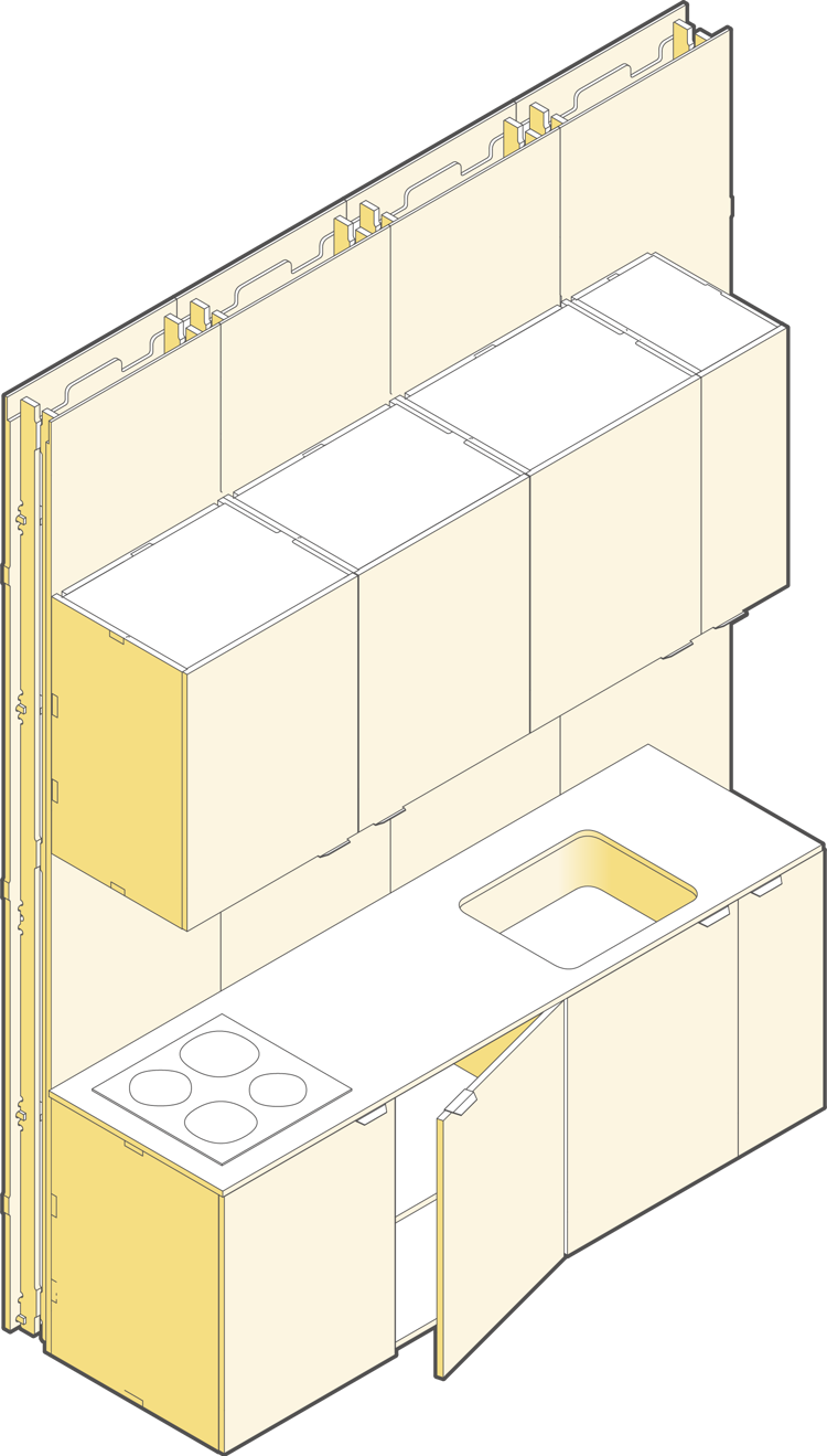 De elementen voor de keuken worden uit grote platen gefreesd. Dit gaat heel precies waardoor er bijna geen resthout, dus weinig afval, overblijft. Al deze elementen vormen samen een bouwpakket, wat het plaatsen heel eenvoudig maakt. Gaat er later iets kapot? Dan hoeft er ook nog maar één paneel vervangen te worden, in plaats van de hele keuken. Zo gaan we zuinig om met de materialen. De Modulaire Keuken heeft een eigen achterwand, zodat leidingwerk niet meer in de muren gefreesd hoeft te worden. Ook kan dit over bestaand tegelwerk geplaatst worden. Dat zorgt ervoor dat we makkelijk bestaande keukens kunnen vervangen voor de Modulaire Keuken.