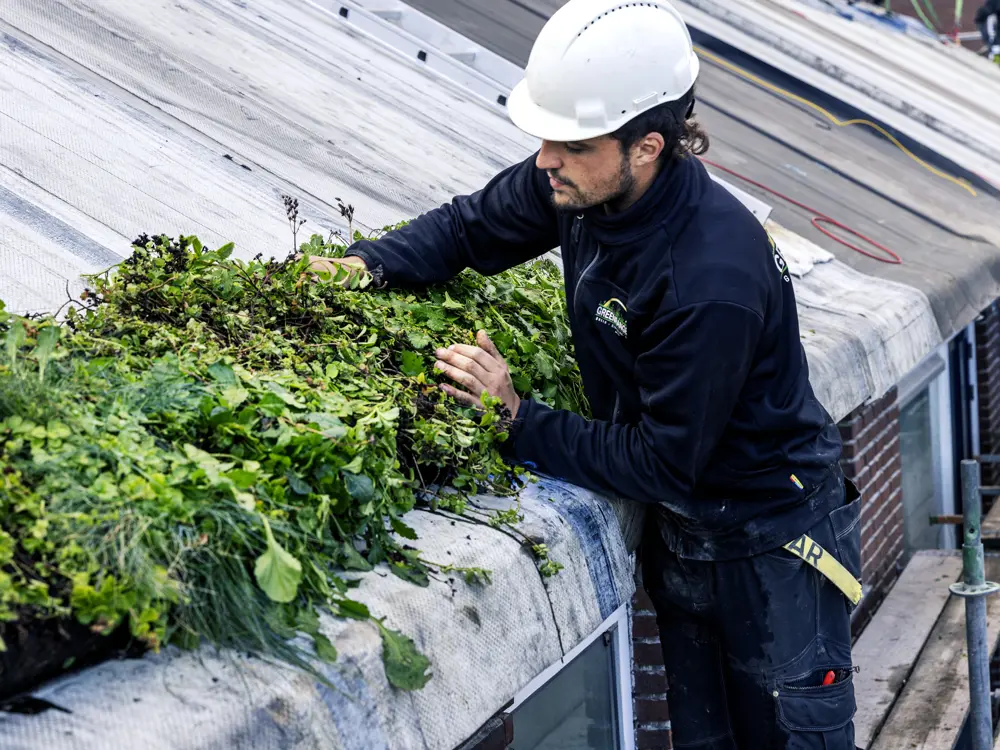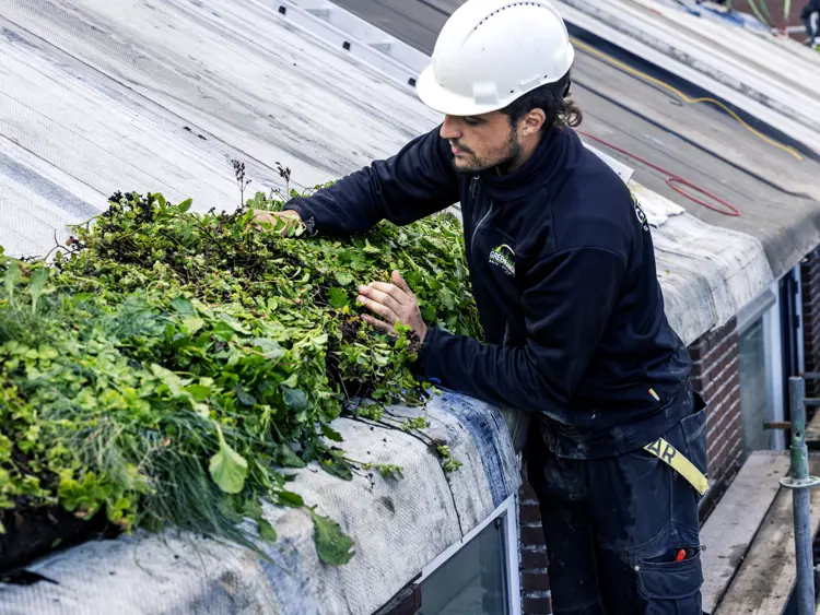 Patina heeft nu een prefab klapdak ontwikkeld dat in een dag wind- en waterdicht geïnstalleerd kan worden. Daarom kunnen we snel werken. Het prefab dak is geïsoleerd met biobased materiaal. Er zitten lichtgewicht circulaire zonnepanelen op en het wordt bekleed met bakken met groen. Het vastzetten gebeurt met klittenband. Het dak vangt regenwater op in een ton of een ondergrondse wateropslag. Als het lange tijd droog is, wordt dat gezien door daksensoren. De opslag levert dan water voor het irrigatiesysteem op het dak. En last but not least, in het dak zitten ook nog eens nestkastjes verwerkt voor vogels en vleermuizen. Aan alles is gedacht.’