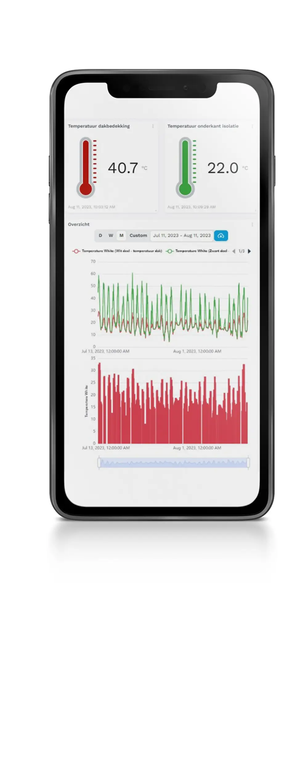 ‘Een paar jaar geleden kwamen we in contact met het bedrijf Inscio’, zegt Thomas. ‘Dat heeft slimme sensoren ontwikkeld die in daken worden geplaatst en daar metingen doen. De sensoren zijn via een openbaar LoRa-netwerk verbonden en de meetwaarden zijn real-time inzichtelijk. We kunnen zien hoe luchtvochtigheid, vocht en temperatuur zich ontwikkelen in het dak, plat of hellend. Zo kunnen we afwijkingen signaleren en vroegtijdig ingrijpen als er een lek ontstaat of zich andere problemen voordoen.’