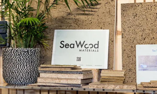 Ligt de toekomst van duurzaam bouwen in zee? Volgens de ontwerper deels wel. Het bedrijf BlueBlocks Concepts maakt plaatmateriaal van zeewier. Op basis van de test bij The Green Village is deze wand van zeewier verbeterd. Dat product is nu opgeschaald bij de Alliantie.