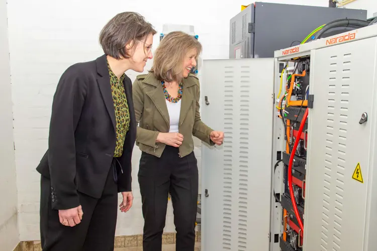 Astrid Janssen en Joan van der Burgt bekijken de batterij