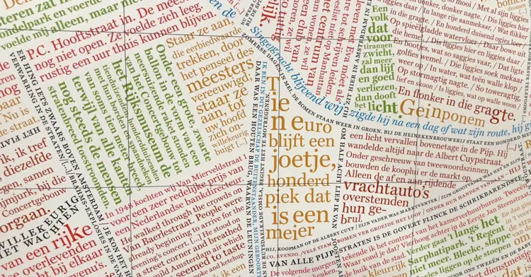 De lobby van ons kantoor in Amsterdam is het decor van een bijzondere plattegrond: de stad in de vorm van citaten en songteksten van beroemde schrijvers. Deze grafische kaart nodigt uit om de stad al lezend te ontdekken, waarbij elke straat en gracht zijn eigen literaire referentie heeft.